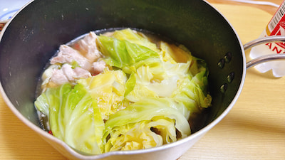 鶏肉を入れ、キャベツを加えて蓋をして煮ます。キャベツがしなしなとなったら完成です。