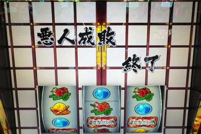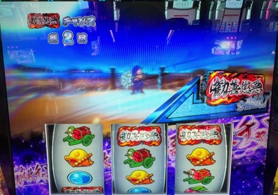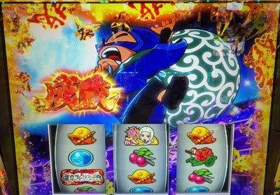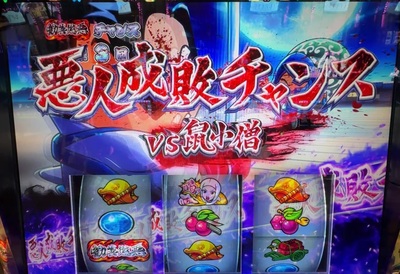 オレンジ色の「勧善懲悪」BARを逆押しすると、BAR揃いのほかに、チェリーが止まったりスイカが止まったりするんです。